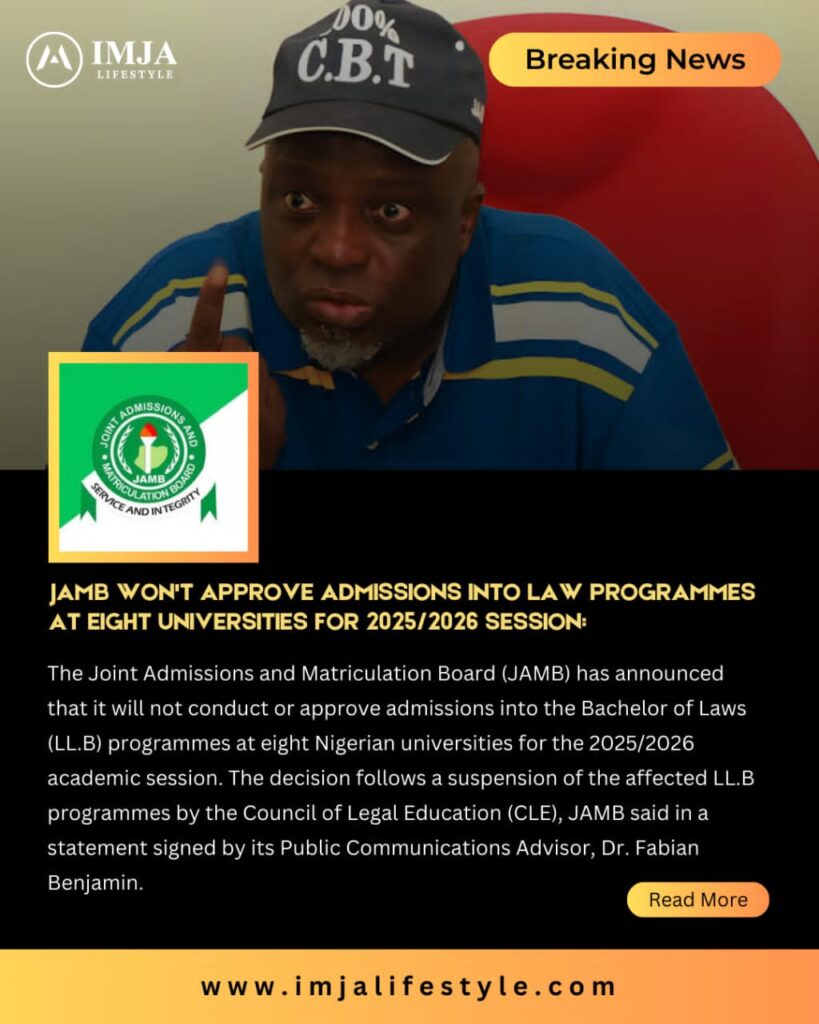 The Joint Admissions and Matriculation Board (JAMB) has announced that it will not conduct or approve admissions into the Bachelor of Laws (LL.B) programmes at eight Nigerian universities for the 2025/2026 academic session.