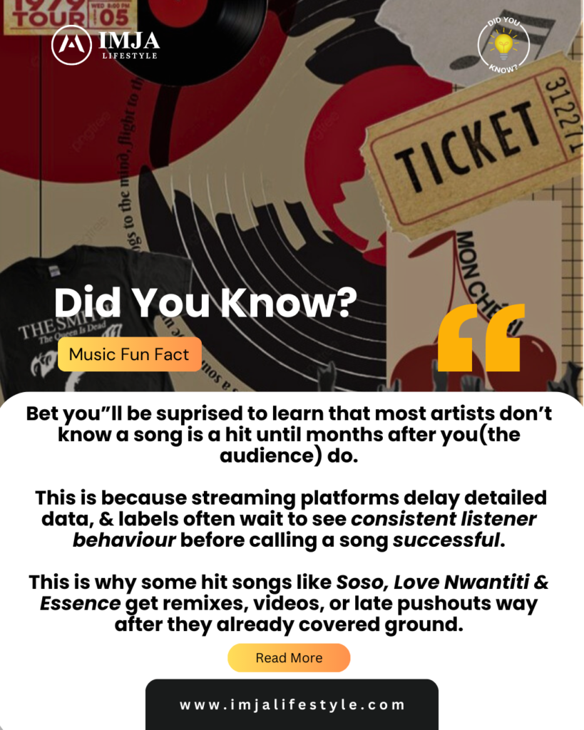 Bet you”ll be suprised to learn that most artists don’t know a song is a hit until months after you(the audience) do. This is because streaming platforms delay detailed data, & labels often wait to see consistent listener behaviour before calling a song successful.This is why some hit songs like Soso, Love Nwantiti & Essence get remixes, videos, or late pushouts way after they already covered ground.