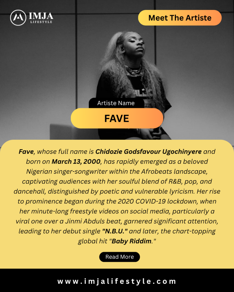 Fave, whose full name is Chidozie Godsfavour Ugochinyere and born on March 13, 2000, has rapidly emerged as a beloved Nigerian singer-songwriter within the Afrobeats landscape, captivating audiences with her soulful blend of R&B, pop, and dancehall, distinguished by poetic and vulnerable lyricism. Her rise to prominence began during the 2020 COVID-19 lockdown, when her minute-long freestyle videos on social media, particularly a viral one over a Jinmi Abduls beat, garnered significant attention, leading to her debut single “N.B.U.” and later, the chart-topping global hit “Baby Riddim.”