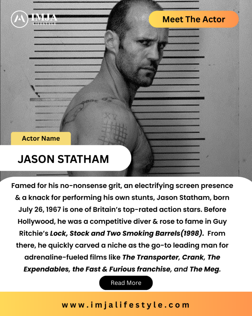 Jason Statham (born July 26, 1967) is one of Britain’s most recognizable action stars, famed for his no-nonsense grit and electrifying screen presence. Before Hollywood came calling, he was a competitive diver—a discipline that gave him the physicality and precision he brings to his roles. Statham broke out in Guy Ritchie’s cult classic Lock, Stock and Two Smoking Barrels (1998) and quickly carved a niche as the go-to leading man for adrenaline-fueled films like The Transporter, Crank, The Expendables, the Fast & Furious franchise, and The Meg.